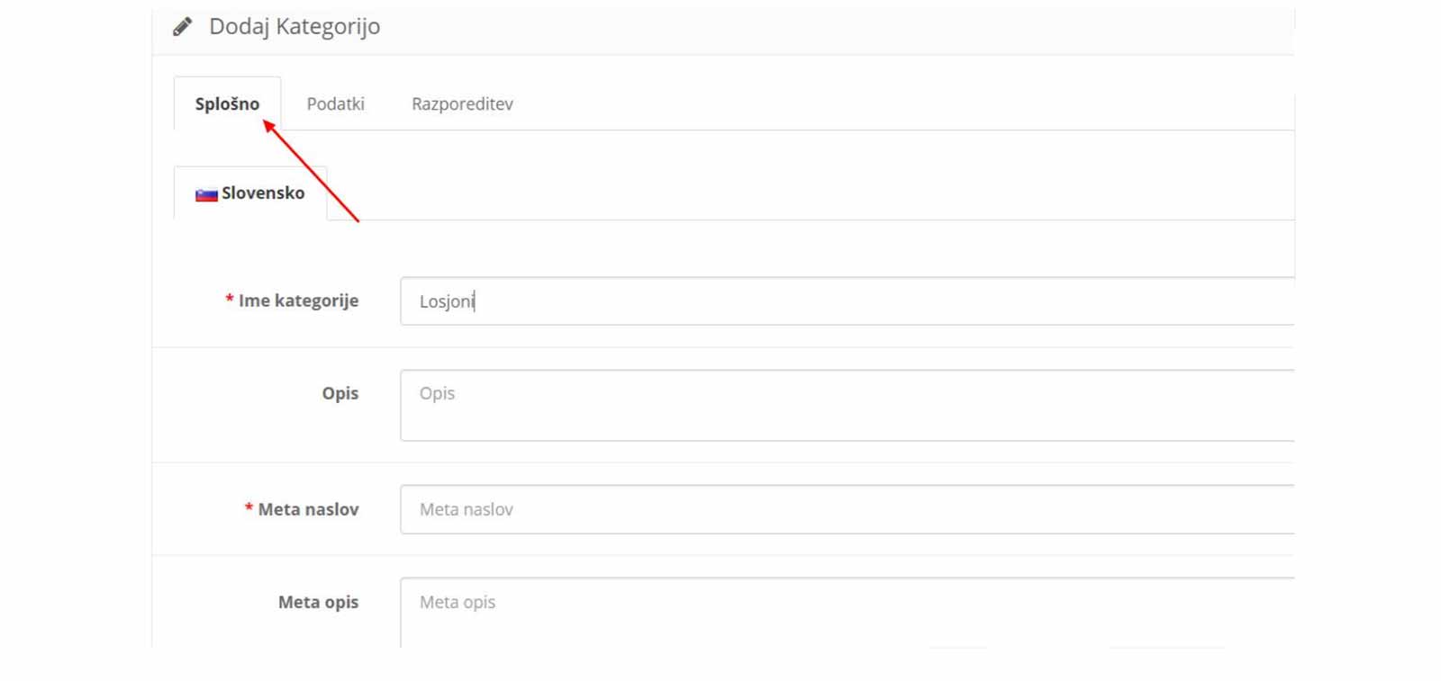 Najprej vpišemo ime kategorije in meta naslov. Lahko dodamo opis – večinoma pa ga kategorije nimajo. Če dodamo opis se ta prikaže na vrhu pred izdelki, ki so v tej kategoriji.