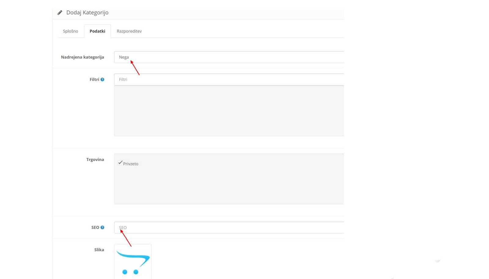 Pod podatki vpišemo nadkategorijo, če jo nova kategorija ima in seo. Lahko dodamo tudi sliko kategorije, ki se pokaže zraven opisa (pri tem pazimo, da so vse slike kategorij enake velikosti).