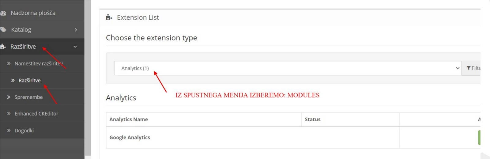 Sedaj iz levega menija izberemo Razširitve in kliknemo na Razširitve, da se nam odprejo na sredini. Iz spustnega menija izberemo Modules.