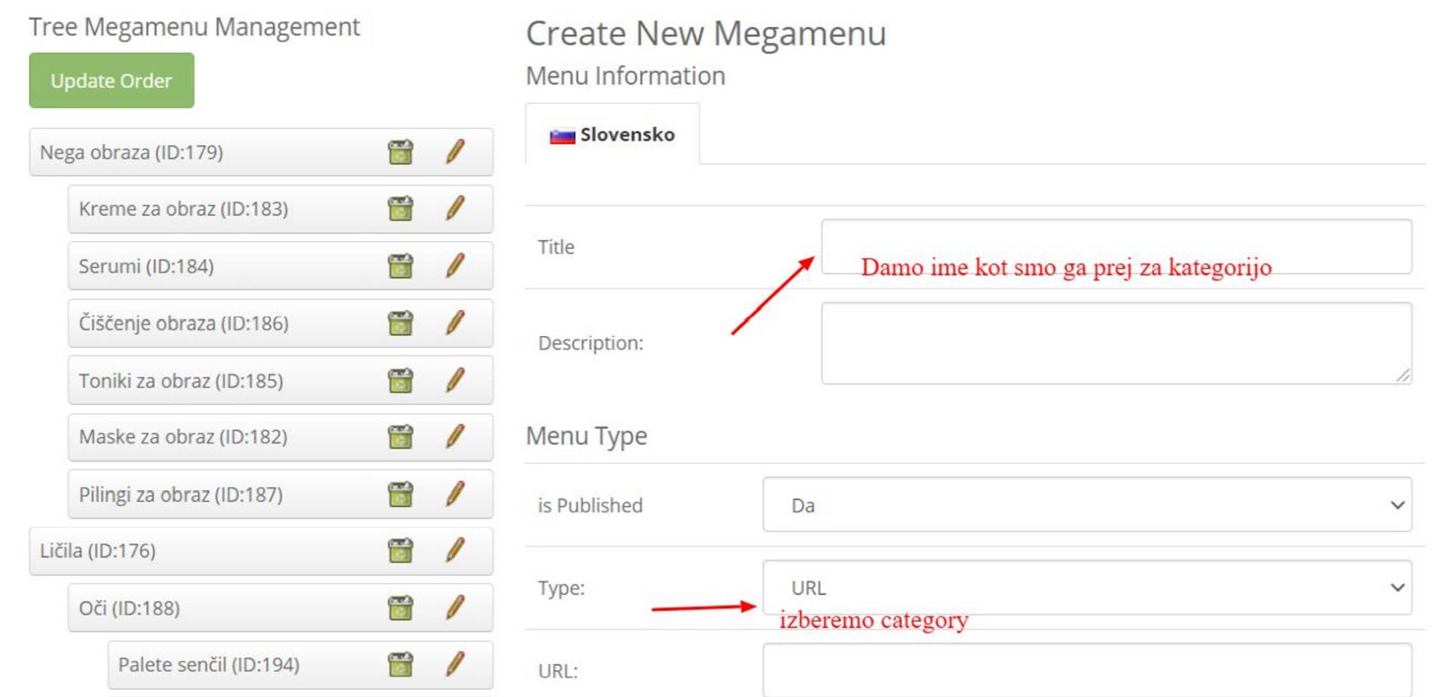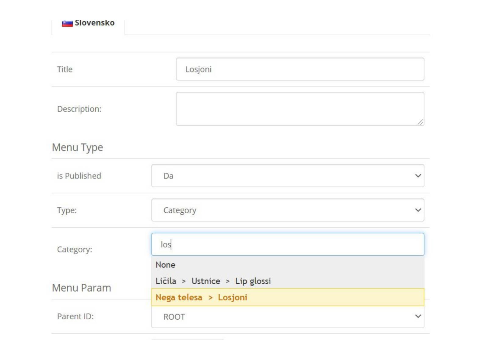 Dodati želimo Losjone pod zgornji meni Nega telesa (pred tem smo naredili kategorijo v prvem koraku). Vpišemo Losjoni pod Title, pod Type iz spustnega seznama izberemo Category.