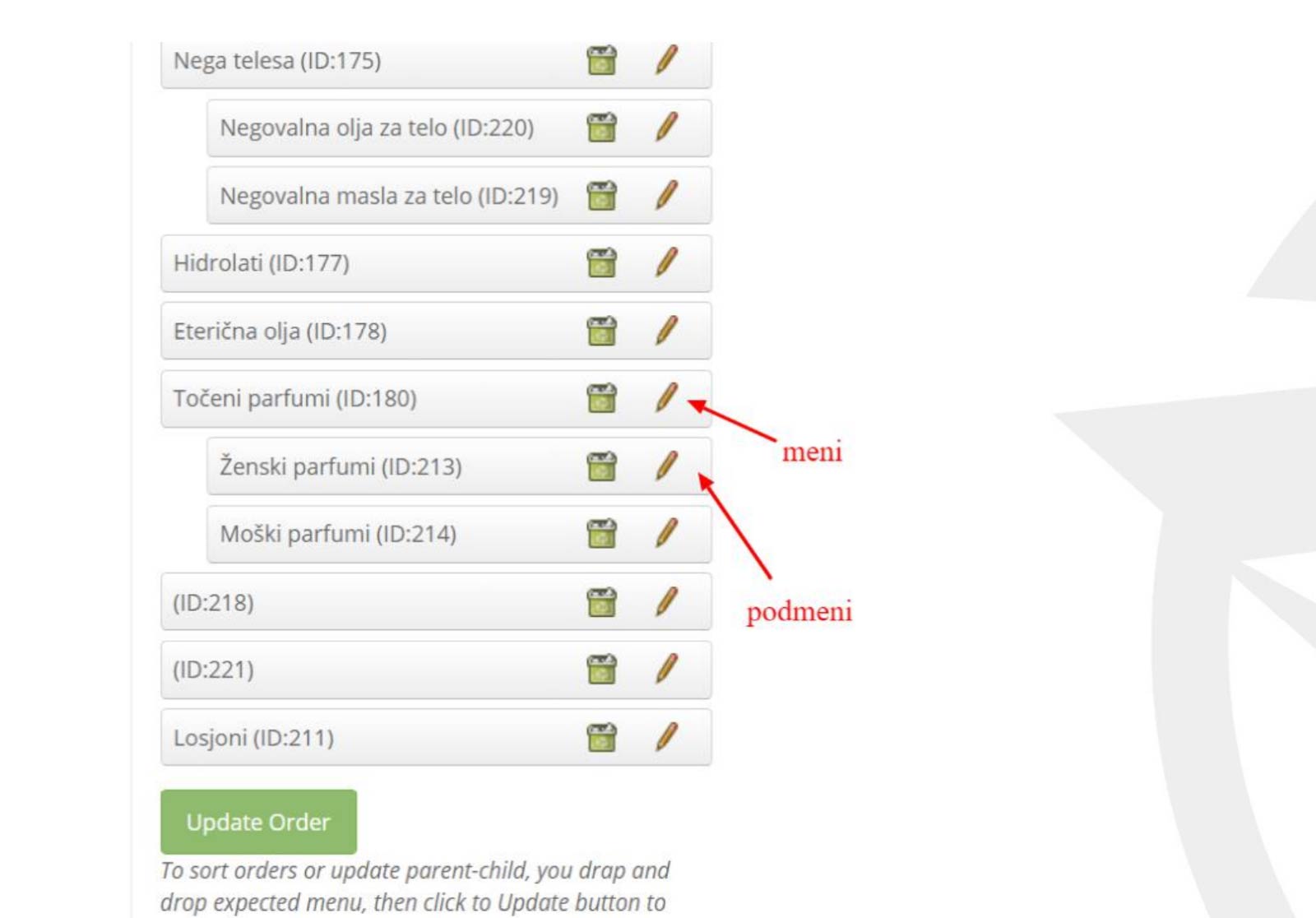 Novi meni se nam pojavi na koncu seznama. Z miško kliknemo nanj in ga prenesemo na pravo mesto. Pazimo, da ga pravilno postavimo, če je podmeni in ima nad sabo glavni meni (glej sliko kjer se vidi pozicija lavnega menija in podmenija). Ko je na pravem mestu kliknemo na UPDATE ORDER.