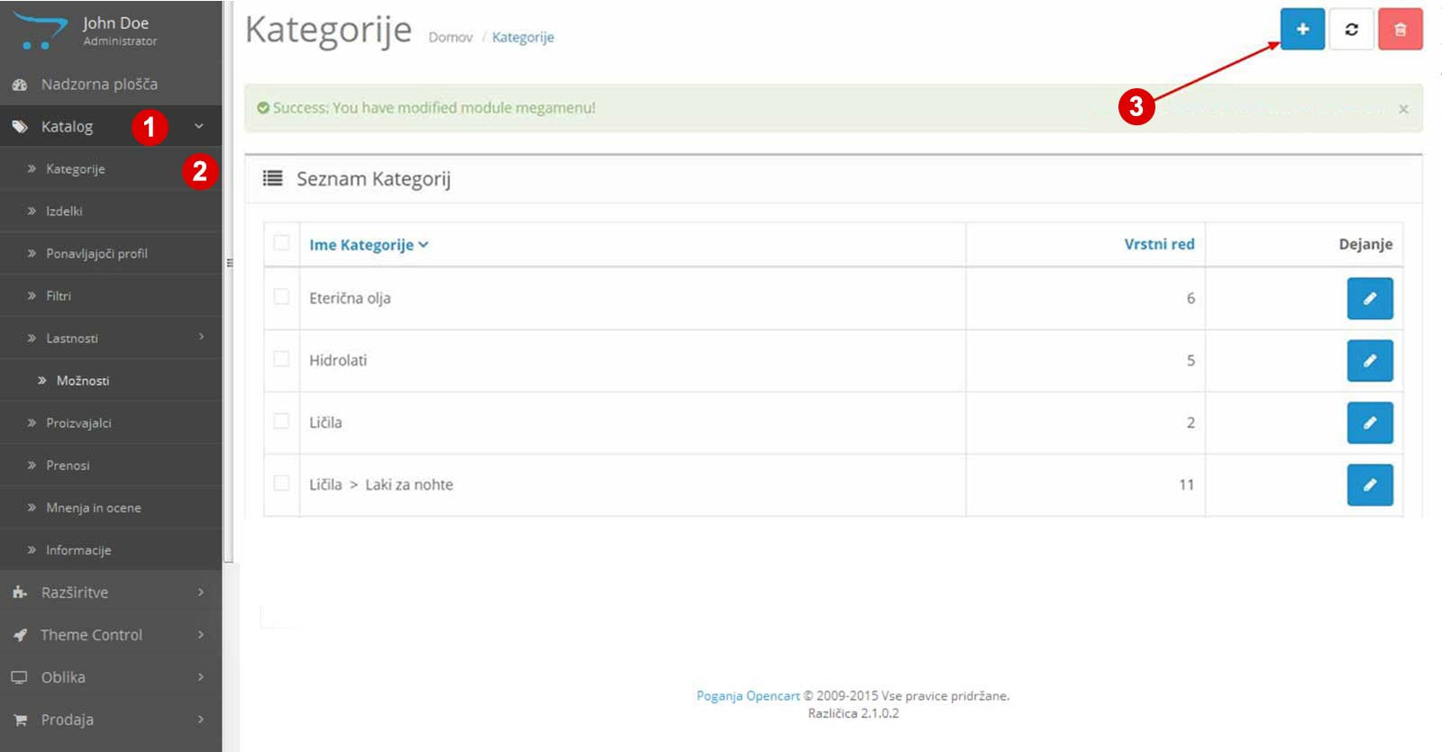 Prijavimo se na nadzorno ploščo. V levem stranskem meniju nadzorne plošče izberemo 1) Katalog ter kliknemo 2) Kategorije. Odpre se nam seznam vseh kategorij. Novo kategorijo ustvarimo tako, da v zgornjem desnem kotu vmesnika kliknemo gumb 3) +. Po kliku gumba se odprejo polja za urejanje menija.