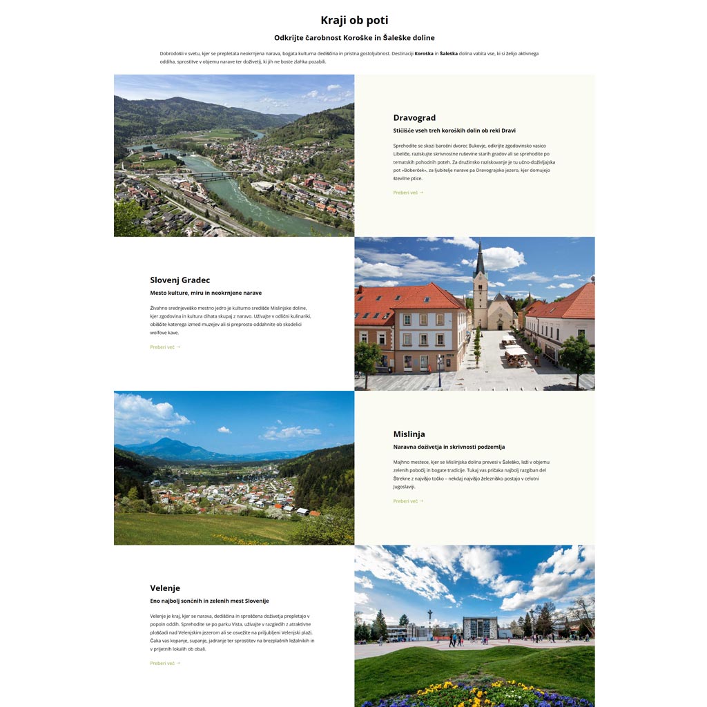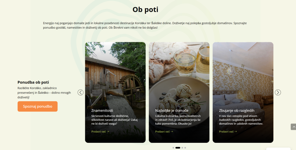 Kraji in ponudniki ob poti so izpostavljeni na pregleden in vizualno privlačen način – vsak kraj ali ponudnik ima svojo predstavitveno stran z opisom, fotografijami, kontakti in lokacijo na zemljevidu. Uporabniki lahko s pomočjo interaktivnega zemljevida hitro raziskujejo možnosti ob trasi ter načrtujejo svoj obisk glede na zanimivosti in ponudbo, ki jih pot ponuja.